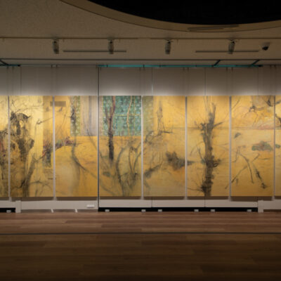 木々の間の地面は雪に覆われ、ヒメリュウキンカと水仙、ツワブキが見える。
