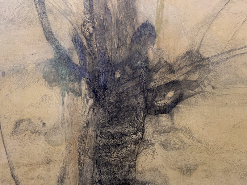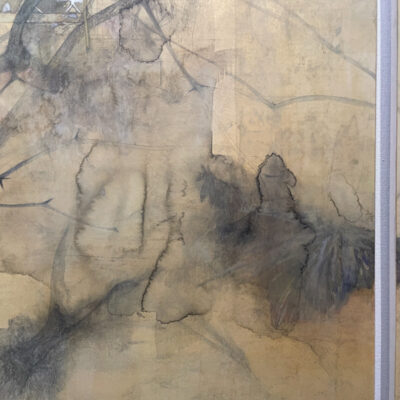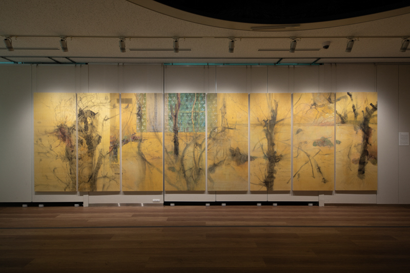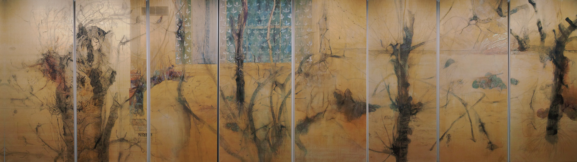 枯れた山ごぼうの茎が垂れて、中央正面にはサッシ越しに青緑色のカーテンに双葉を模した模様が連続している。